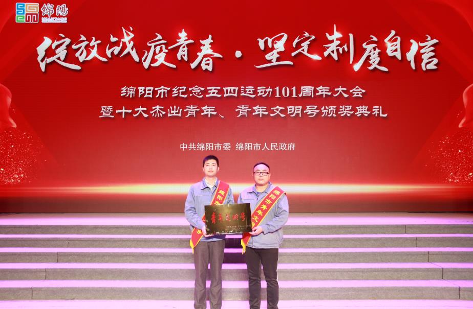 4月28日上午,“绽放战疫青春·坚定制度自信”绵阳市纪念五四运动101周年大会暨十大杰出青年、青年文明号颁奖典礼在绵州剧院举行。绵阳市委书记刘超,市政协主席李亚莲,市委常委、宣传部长、秘书长张学民,市人大常委会副主任李川萍,市政府副市长蒋丽英,市政协副主席李京平等领导出席颁奖典礼。市政府副市长蒋丽英为获得绵阳市“青年文明号”的团体代表颁奖。东材科技党员先锋志愿队荣获绵阳市“青年文明号”荣誉称号,党员杨晨、唐建作为志愿队代表参加了本次典礼。