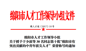 于少波董事长荣获第十批“绵阳市有突出贡献的中青年拔尖人才”荣誉称号