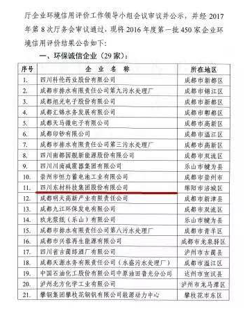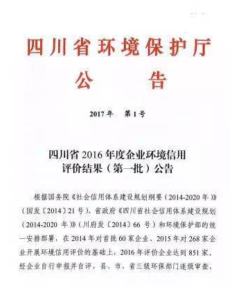 7月21日,四川省环境保护厅发布2017年第1号公告,公布了2016年度第一批企业环境信用评价结果。在全省申报的851家企业中,包括jnty. com在内的29家企业获得四川省2016年度“环境诚信企业”称号。