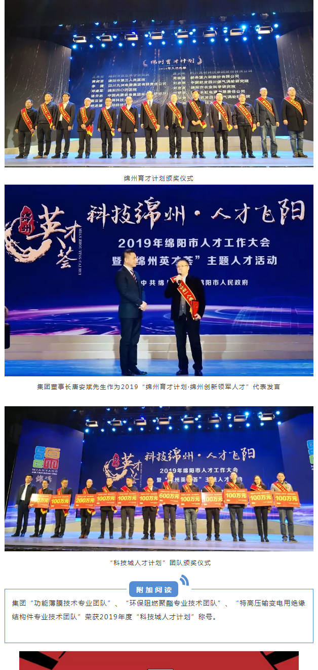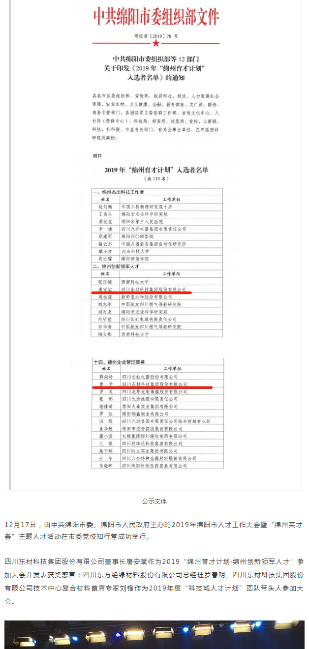 12月10日,绵阳市市委组织部等12部门联合发布《关于印发2019年“绵州育才计划”入选者名单的通知》(绵组通〔2019〕78号),公示了14类125名入选者名单,公司董事长唐安斌成功入选2019“绵州育才计划·绵州创新领军人才”, 总经理曹学成功入选2019年“绵州育才计划·绵州企业管理菁英”。