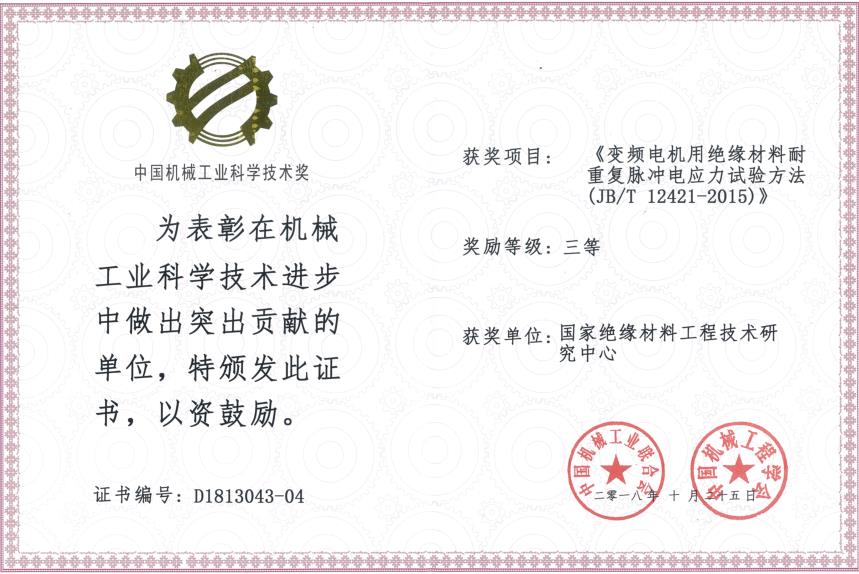 由中国机械工业联合会和中国机械工程学会共同设立“中国机械工业科学技术奖”,是中国机械领域最具权威的奖项之一。近日,2018年度中国机械工业科学技术奖获奖项目公布,我公司(国家绝缘材料工程技术研究中心)参与制定的行业标准JB/T12421-2015《变频电机用绝缘材料耐重复脉冲电应力试验方法》荣获 ...