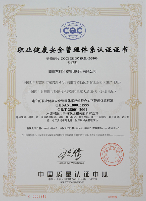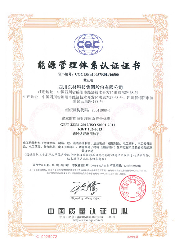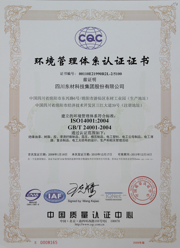 东材科技在国内同行业企业当中率先通过国际ISO9001的质量体系认证,通过ISO10012国际计量体系、ISO14001环境管理认证体系、OHSAS18001职业健康安全体系、GBT 29490知识产权管理体系、GBT23331能源管理体系认证企业、IATF16949汽车质量管理体系认证,不仅使公司产品质量保障体系达到国际化的新标准,而且为产品质量的稳定提供了强有力的保障。